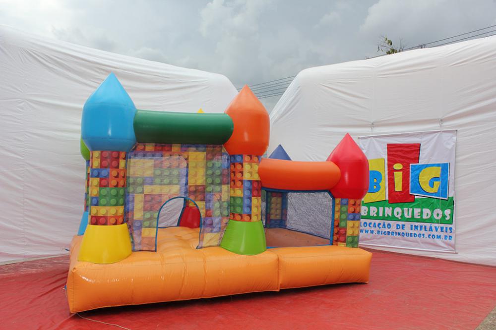 Diversão em dobro pula-pula integrado com piscina de bolinhas tematizado com blocos de montar multicoloridos, ótima opção para pouco espaço, a criança pode brincar nos dois sem sair do brinquedo.
